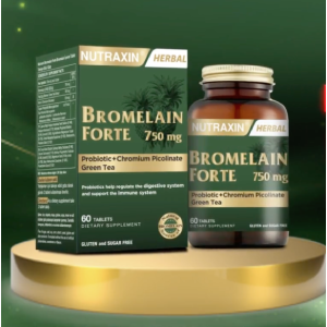 Nutraxin Bromelain Forte; ananastan elde edilen ve proteinleri sindiren enzim olan bromelain (2400 GDU/g), Yeşil çay ekstresi, Krom ve Probiyotik içerir.