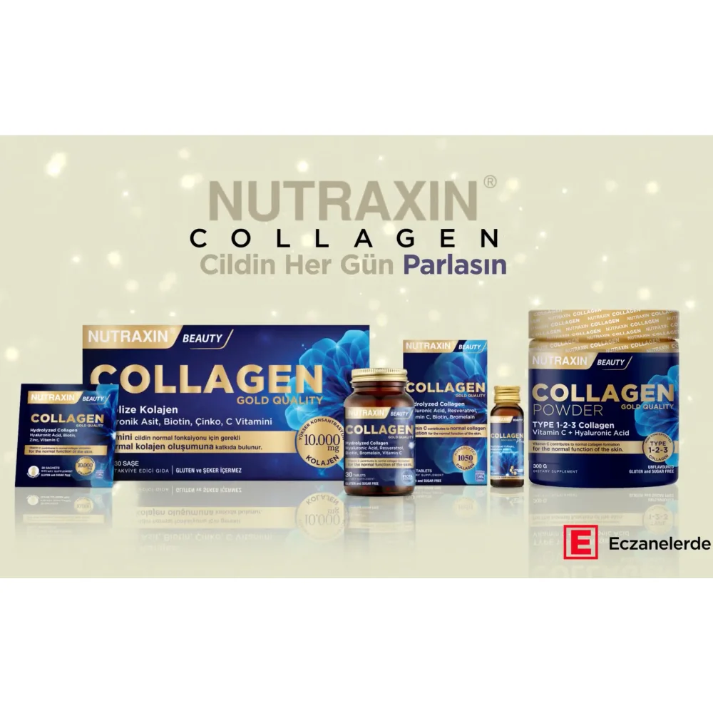 Nutraxin Collagen tablet, resveratrol, hyalüronik asit ve bromelaini bir arada sunan özel bir formülasyondur. İçeriğinde yer alan kolajen, kolay emilim sağlayabilen hidrolize kolajendir. Cildin korunmasına katkı sağlayan biotin ve çinko ile desteklenmiştir.