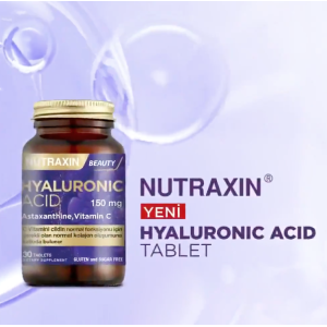 Nutraxin Hyaluronic Acid tablet, içeriğinde Hyalüronik asit, C vitamini ve astaksantin bulunan bir formülasyondur.